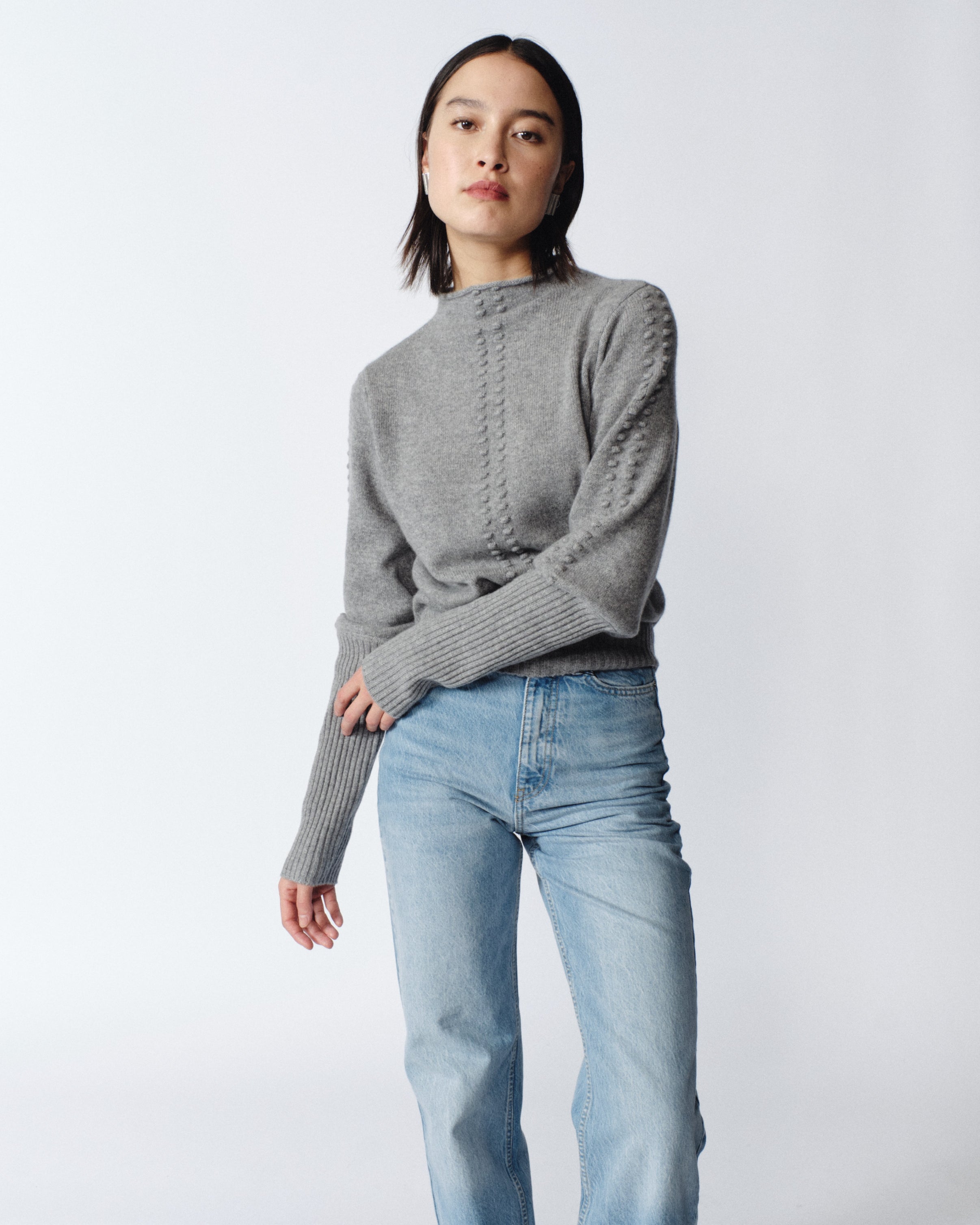 The Chelsea Sweater is our semi-cropped take on the classic crewneck—knitted from plush cashmere with billowy sleeves and a vintage bubbled detail that can be worn at the front or back.