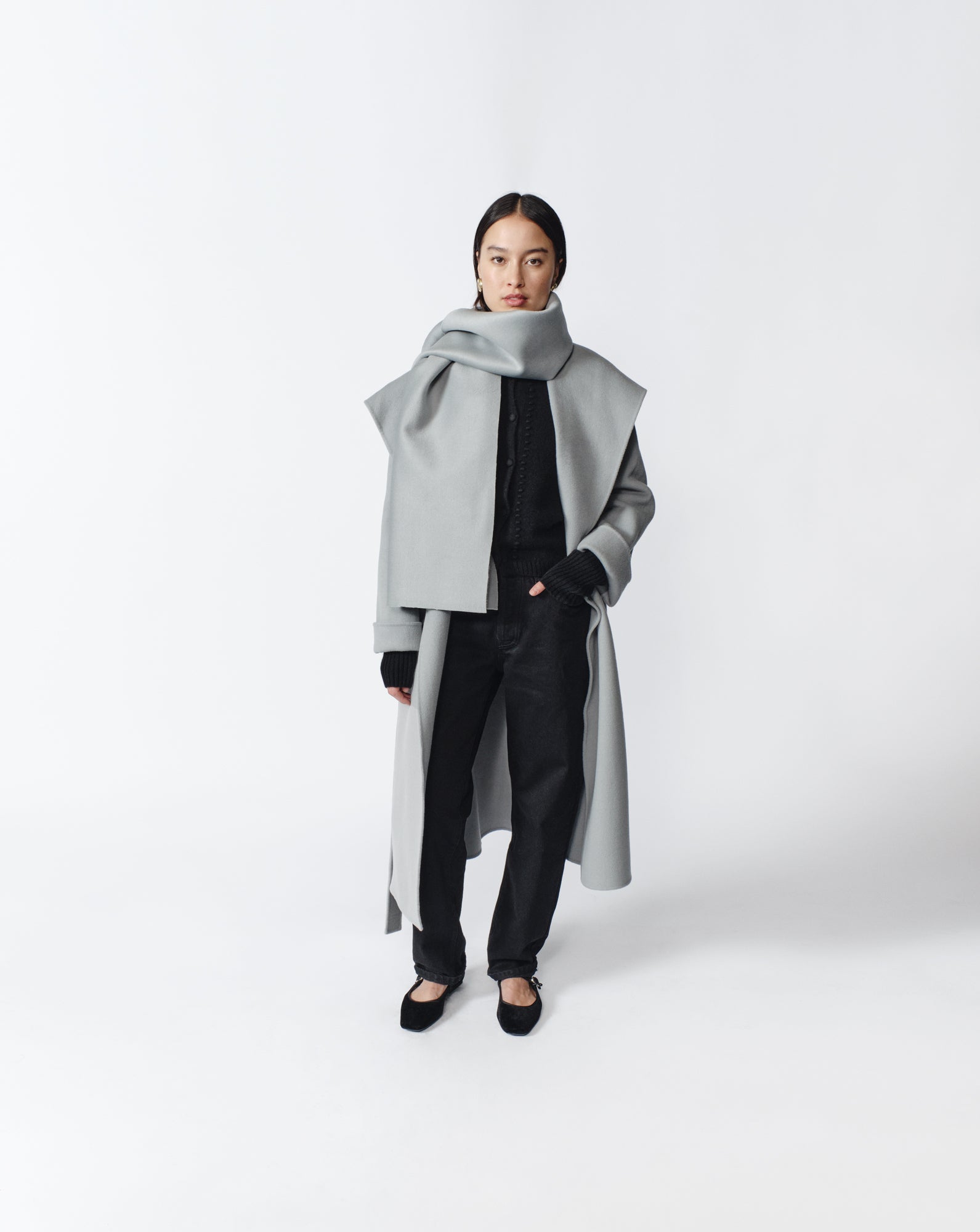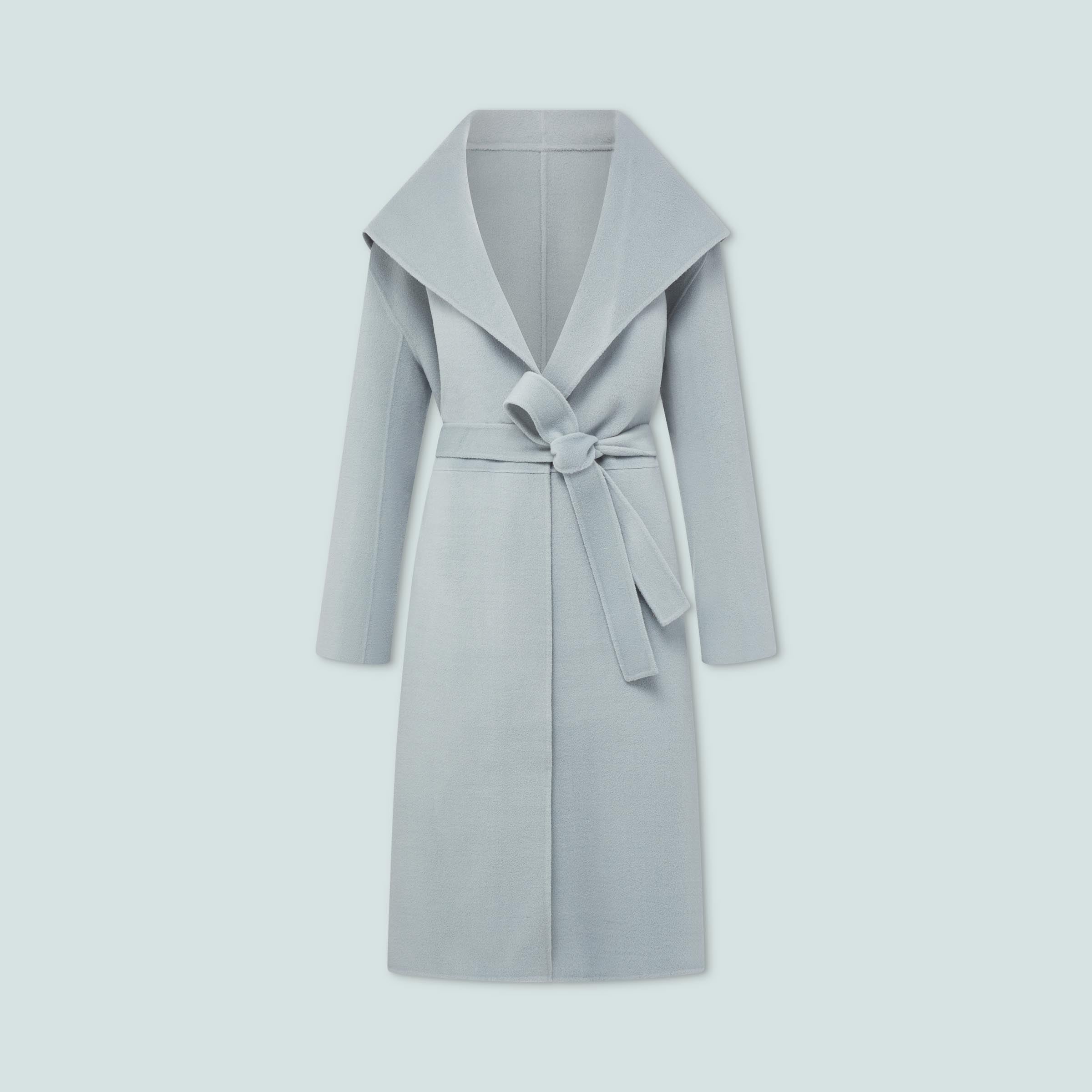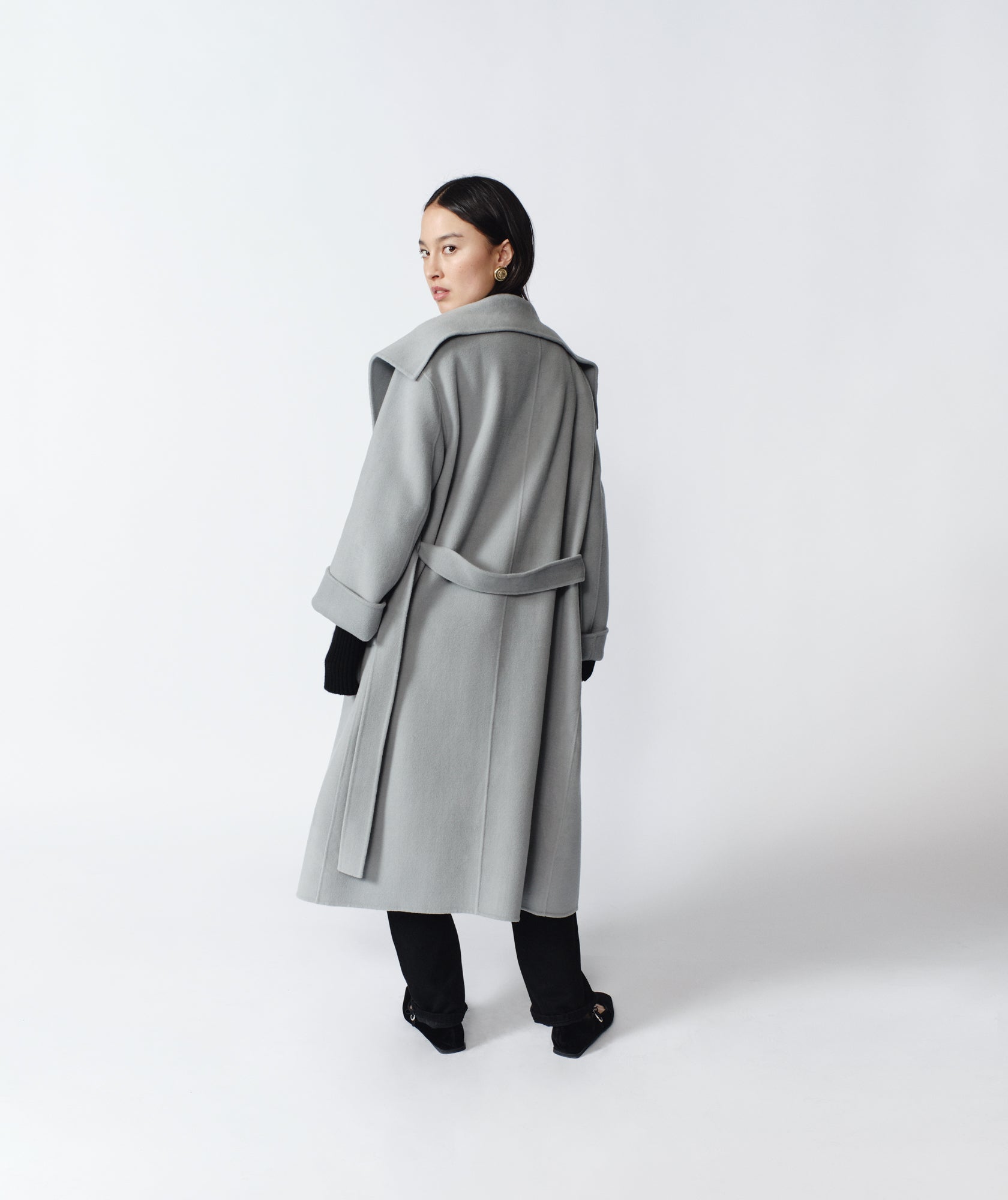 A sculptural cashmere‑wool wrap coat with an oversized draped collar and self‑tie belt—elevated comfort, artfully considered.