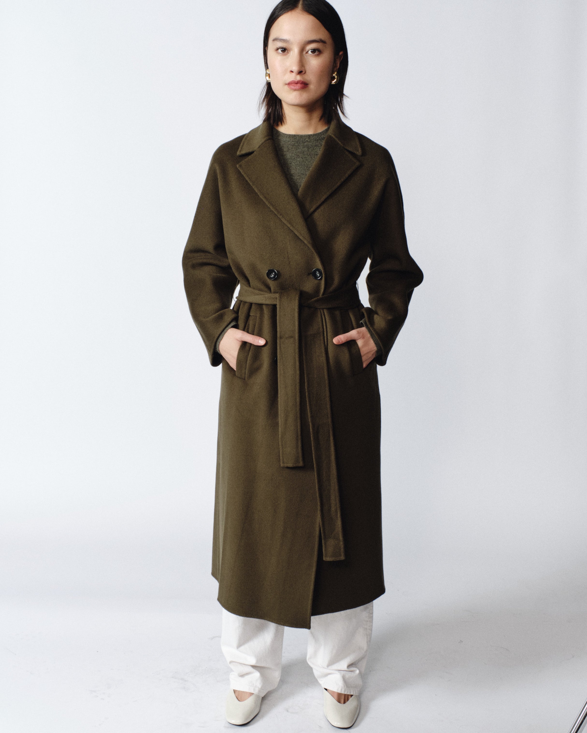 Introducing a luxurious cashmere and wool coat to keep you warm all season long. This soft and chic outer layer buttons in the front and includes two oversized pockets (perfect for holding your phone), a folded collar, and a waist belt.